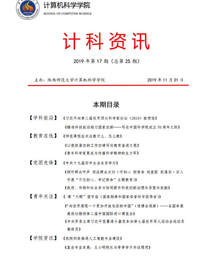 《计科资讯》是耽美小说 编辑整理的电子资讯,信息来源为《光明日报》《人民日报》《中国青年报》等权威纸媒,编辑工作由学院优秀本科生党员、团员承担。《计科资讯》主要包括学科前沿、教育在线、党团先锋、青年关注及学院资讯五个版块。学院师生可以从中了解到专业前沿和国家时政大事,欢迎大家下载阅读。