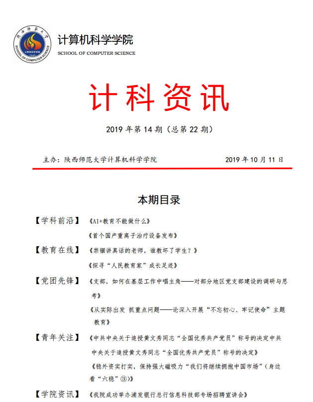 《计科资讯》是耽美小说 编辑整理的电子资讯,信息来源为《光明日报》《人民日报》《中国青年报》等权威纸媒,编辑工作由学院优秀本科生党员、团员承担。《计科资讯》主要包括学科前沿、教育在线、党团先锋、青年关注及学院资讯五个版块。学院师生可以从中了解到专业前沿和国家时政大事,欢迎大家下载阅读。