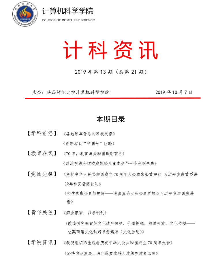 《计科资讯》是耽美小说 编辑整理的电子资讯,信息来源为《光明日报》《人民日报》《中国青年报》等权威纸媒,编辑工作由学院优秀本科生党员、团员承担。《计科资讯》主要包括学科前沿、教育在线、党团先锋、青年关注及学院资讯五个版块。学院师生可以从中了解到专业前沿和国家时政大事,欢迎大家下载阅读。