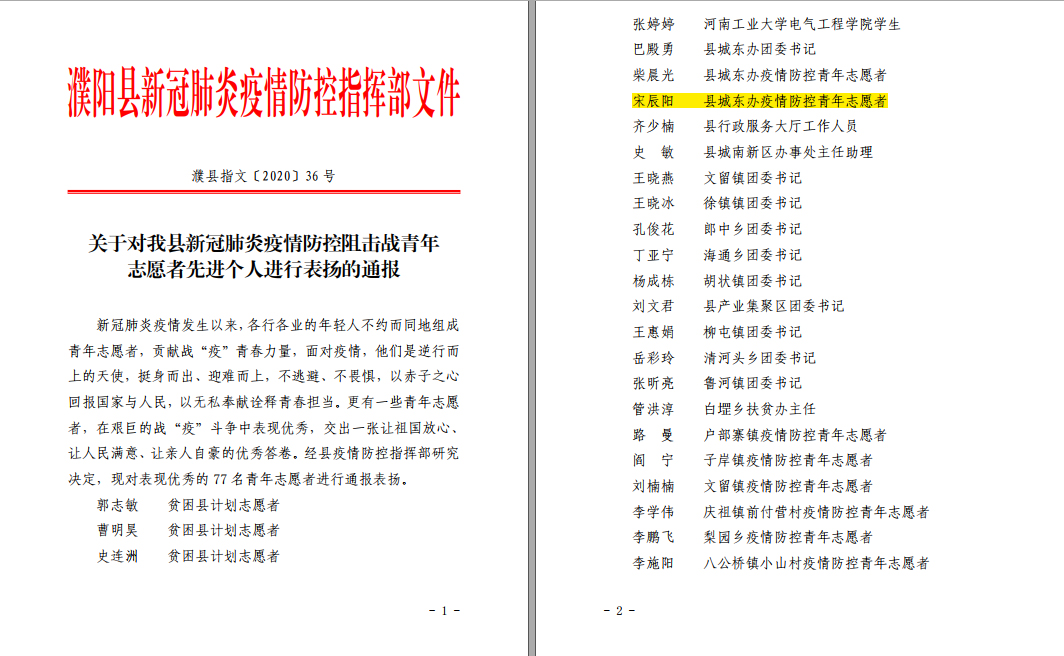 3月14日,学院收到了来自河南省濮阳县新冠肺炎防控指挥部文件,对疫情防控工作中的优秀青年志愿者进行了表扬。耽美小说
