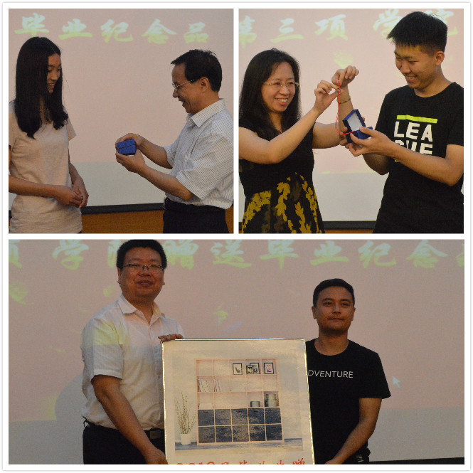随后,学院和毕业生互送礼物。首先院长王小明和副院长马苗代表学院为毕业生代表赠送纪念品——定制纪念戒。纪念戒盒子上印着学院院徽和耽美小说