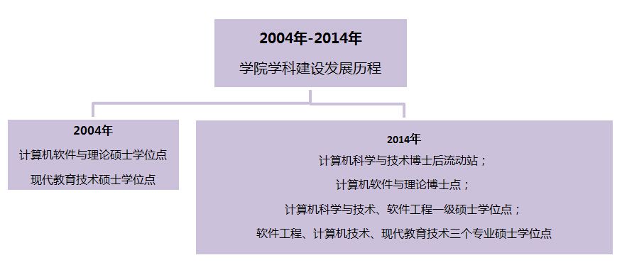 2004年时,学院仅有计算机软件与理论和现代教育技术两个硕士学位点;2014年时,学院已有计算机科学与技术博士后流动站、计算机软件与理论博士学位点(这也是国内师范大学的首个计算机类博士点),计算机科学与技术和软件工程两个一级硕士学位点以及软件工程、计算机技术和现代教育技术三个专业硕士学位点,基本建成了涵盖本、硕、博、后的学科体系,其中:计算机科学与技术是陕西省特色专业,计算机软件与理论是陕西省重点学科。