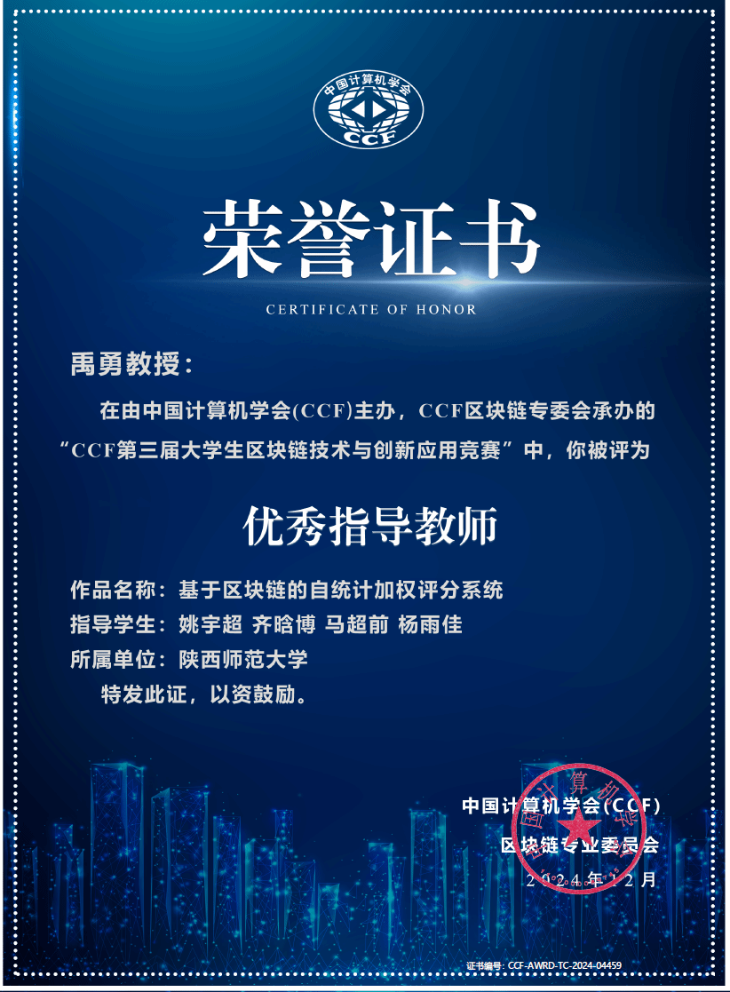 禹勇教授指导,姚宇超、齐晗博、马超前、杨雨佳组成的团队,凭借其创新作品“基于区块链的自统计加权评分系统”成功晋级决赛。在决赛的现场答辩、作品展示及专家评审环节中,团队成员凭借扎实的专业知识、创新的技术方案以及出色的团队协作能力,赢得了评委的一致好评,最终荣获二等奖,禹勇教授被评为优秀指导教师。