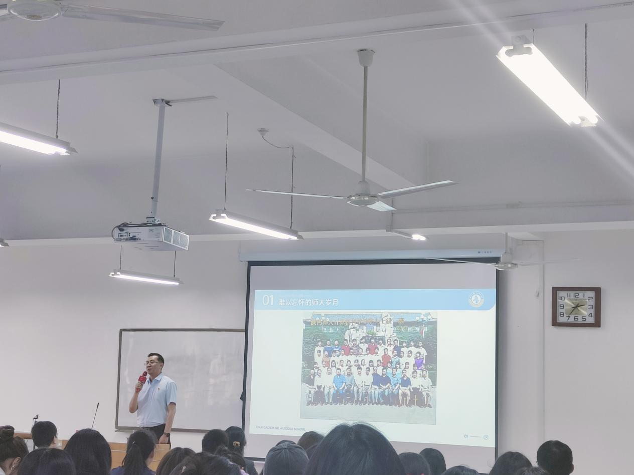 万江老师针对师范生的成长与发展,结合自身从一名师范生的初次从教,到从事全校教育管理等多个阶段,和同学们交流了自己在求学和工作中的切身体会和心得。以自己的亲身经历为出发点,向同学们讲述了成为一名合格的师范生需要具备的职业信仰、家国情怀、奉献精神、使命担当,并鼓励同学们在今后的教育工作中要敢想、敢干、敢于创新、要拥有敢于将梦想变为现实的勇气和魄力。最后,他展望新时代我国基础教育的发展,对同学们提出了新的要求和希望,希望同学们不忘初心,在教育事业中砥砺前行,开拓一片新天地。