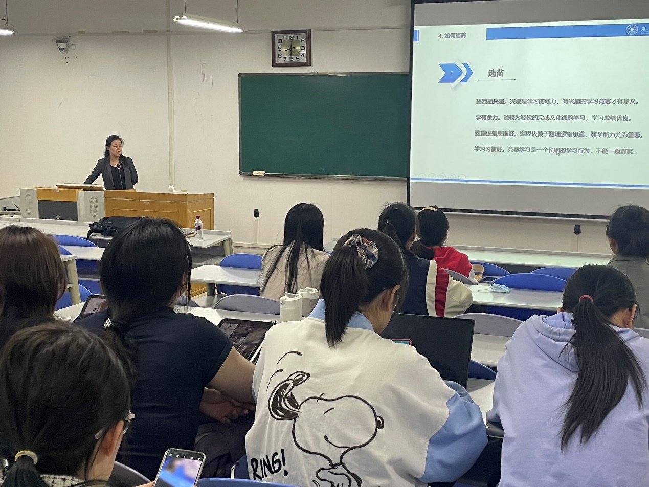 附属中学的竞赛开展情况,介绍了相关赛事的具体流程、培训方法等内容,然后任老师结合自己多年来的竞赛指导经验和教学经验与学生进行了深入讨论和交流。