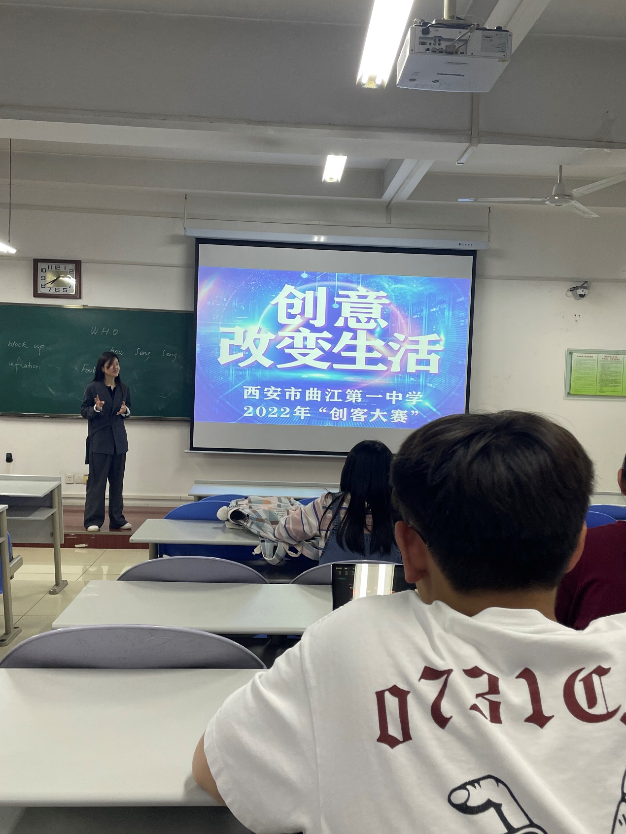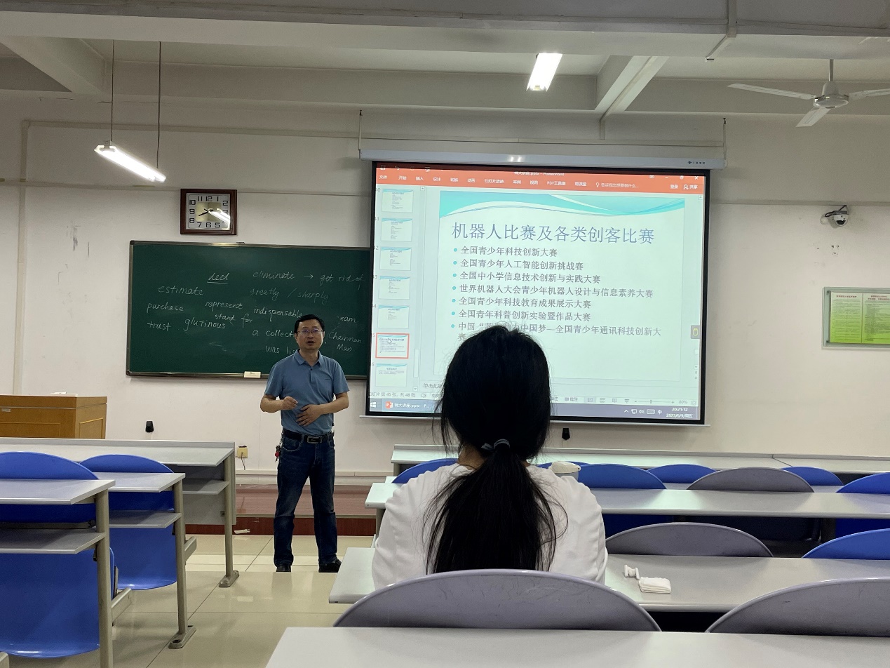 李云海老师针对航天一中的科技活动和科技竞赛概况、教育部关于信息学科竞赛的白名单赛事进行了介绍,李老师还结合自己在学校学科竞赛活动和竞赛指导方面的心得体会给同学们做了详细分享。