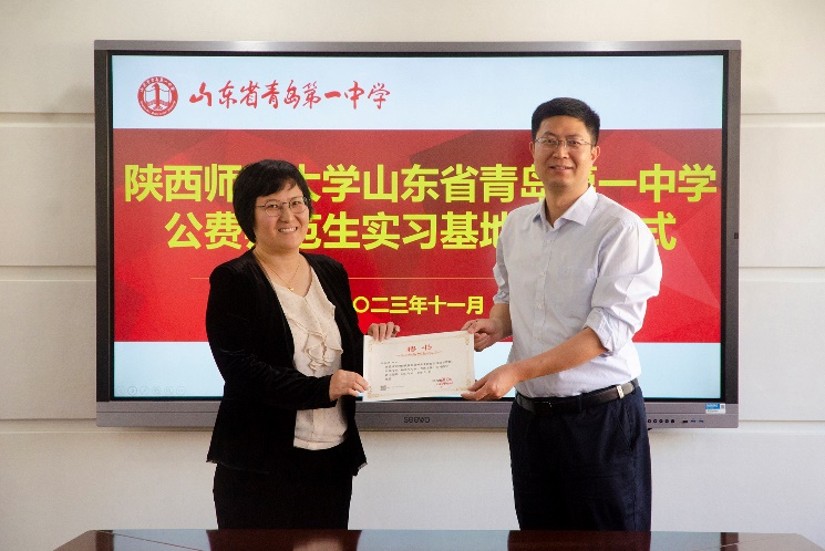 继续开展深化交流,协同培养高质量师范生。李鹏副院长在座谈中感谢青岛一中对实习生的重点培养和对师大实习工作的大力支持,使实习生在教学经验、教育能力方面有显著提高,希望双方继续加强合作,为青岛为山东培养更多卓越教师,同时也希望青岛一中能为师大提供更多的优秀生源。中学指导教师代表和实习生代表均依次发言。最后,由李鹏副院长和青岛一中贺宁副校长共同为教育教学实践基地揭碑,为指导教师们颁发聘书。