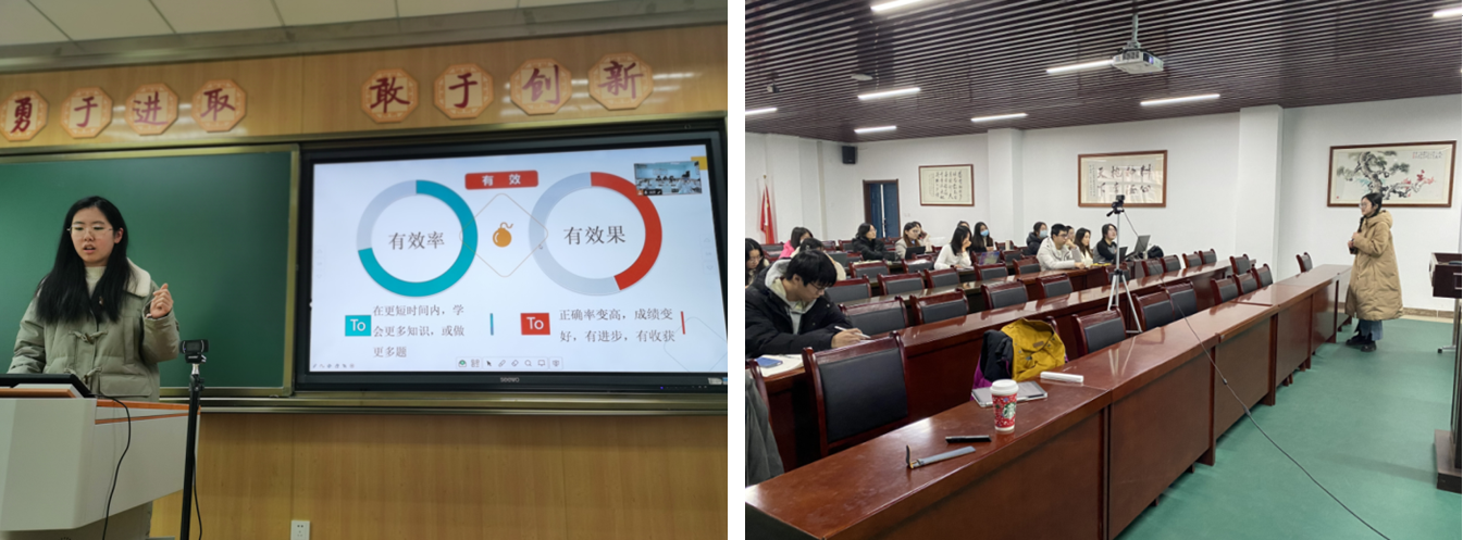 随后,每个组选出6到8位同学以播放讲课视频或线下授课方式,轮流展示了自己的讲课风采及教学设计,本组学科教学论指导老师和全体同学进行了观摩评议,就教学技能、教学方法、教学策略、教学思路等方面进行了较为深入的分享和交流。