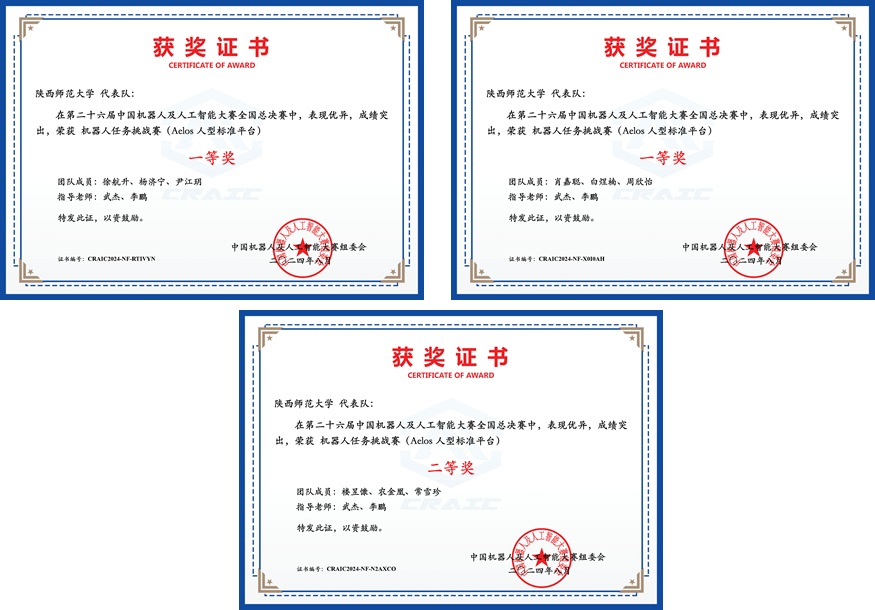人工智能专业2021级本科生肖嘉聪和2022级本科生楼昱慷、徐航升等九名同学在武杰老师的指导下,组建三支队伍参加了本次比赛的CAIR夺宝联盟竞技赛道项目,并以优异的成绩进入国赛。国赛中,来自全国近百所高校的105支队伍同台竞技。最终,经过激烈的角逐,三支队伍均获得全国一等奖。