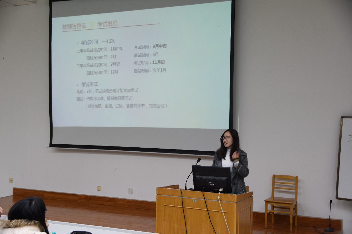 杨美学姐首先结合自身考试经历向大家分享了备考中遇到的问题。她指出,在平时学习期间,要熟练掌握基本知识点,努力提高自身基本素质,积极参加实验项目,努力充实自己、积累经验。紧接着,闫丹丹学姐就何时准备教师资格证考试、如何选择备考资料等方面进行了全面讲解。她强调,在考试之前要充分复习,及时关注考试信息,避免缺考情况的发生。