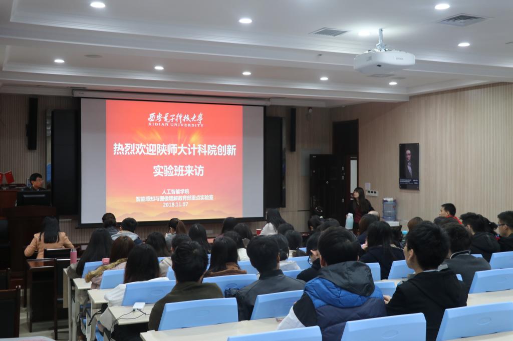 2016级计算机科学与技术创新实验班40余名同学在班主任武杰老师的带领下赴西安电子科技大学人工智能学院开展交流学习。西安电子科技大学计算机科学与技术学部主任焦李成、人工智能学院院长侯彪、智能信息处理研究所副主任张丹,师大计科院副院长马苗、党委副书记袁冰、计创班班主任武杰、任杰,学生辅导员郭康凌、陈应权、安琪以及人工智能学院的部分老师和博士研究生参加了交流活动。本次活动作为陕师大计算机科学与技术创新实验班“我的大学 我的路”主题系列活动之一,旨在引导学生要走出去,积极参与国际竞争,要树立强化自主学习、拓展国际视野和敢于实践创新的意识。