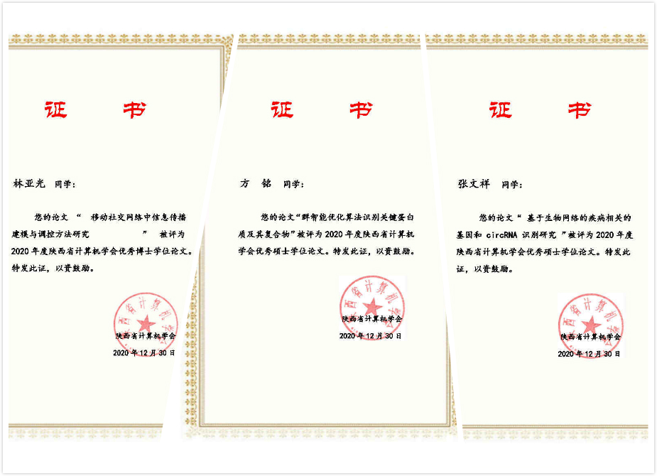根据“陕西省计算机学会关于优秀博士学位论文和优秀硕士学位论文评审的通知”(陕计学文[2020]009号)的相关精神,耽美小说 向陕西省计算机学会推荐了候选名单及支撑材料,经过专家评审博士生林亚光被授予2020年(首届)陕西省计算机学会优秀博士论文;硕士生方铭、张文祥被授予2020年(首届)陕西省计算机学会优秀硕士论文,以表彰他们的博士论文和硕士论文在计算机领域创新及学术影响力方面的突出表现。