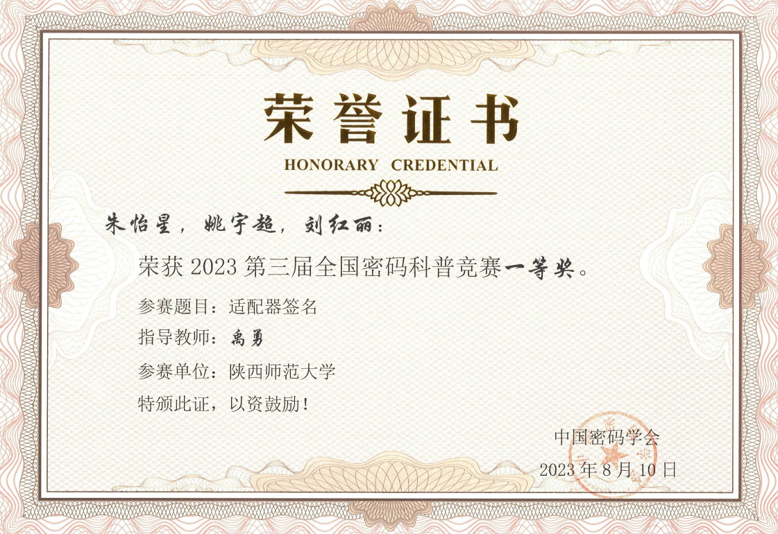 禹勇教授指导的两支参赛队伍在这一全国赛事中取得了出色成绩,作品《适配器签名》荣获一等奖, 队员为朱怡星、姚宇超、刘红丽;作品《零知识证明》荣获二等奖,队员为李一鸣、秦少清、张艳蕾。耽美小说