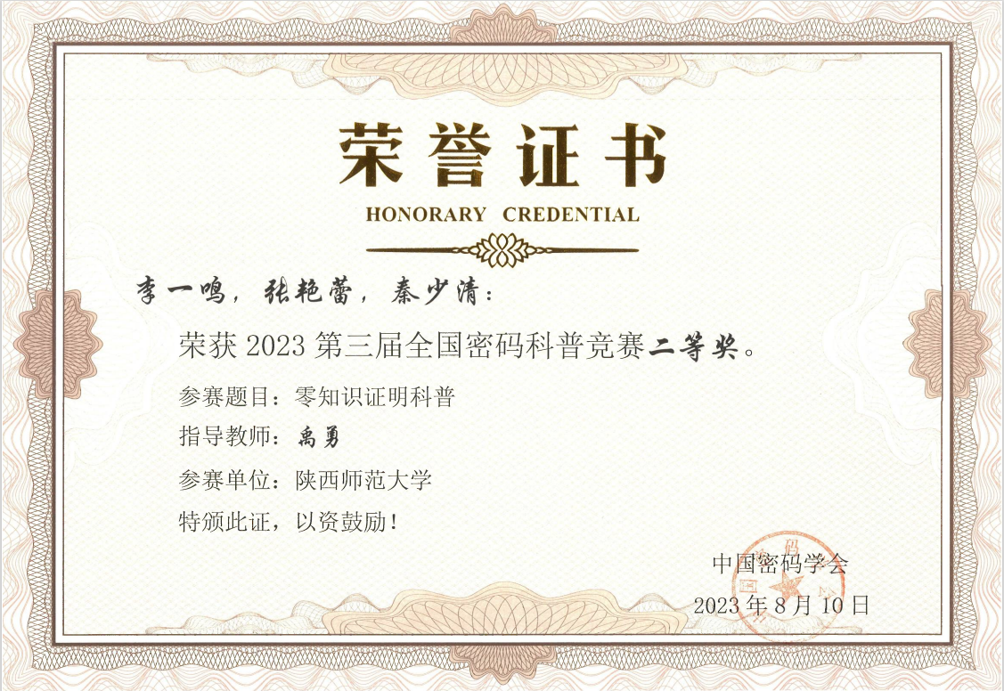 王涛副教授指导的队伍也表现优异,作品《什么是零知识证明》荣获三等奖,队员为高萌、姚景予、张燕。中国科学院院士、中国密码学会理事长王小云教授和国家密码管理局副局长何良生先生为获得一等奖的参赛队伍颁发了证书。