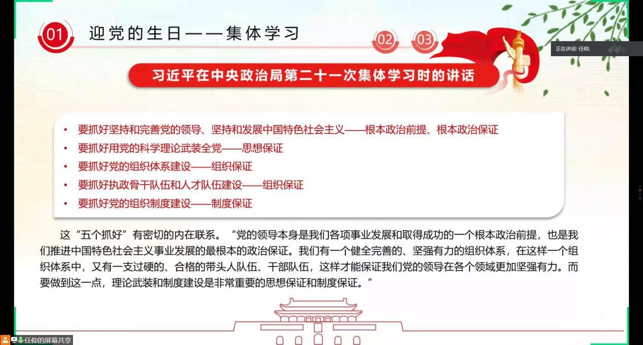 随后,在各党小组组长的带头朗读下,大家共同学习《习近平在中央政治局第二十一次集体学习时的讲话》。习近平总书记强调,我们要毫不动摇坚持和完善党的领导、继续推进党的建设新的伟大工程,贯彻落实好新时代党的组织路线,不断把党建设得更加坚强有力。
