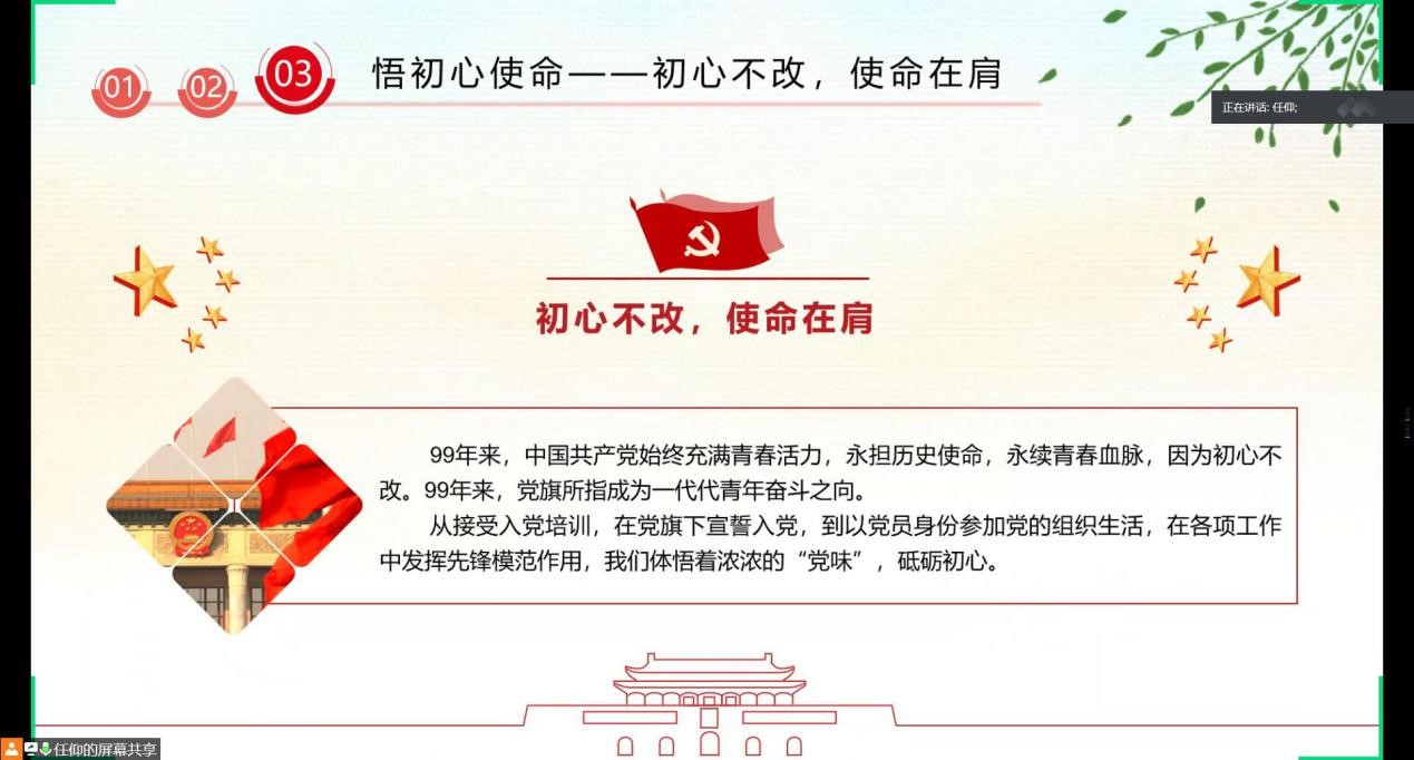学生第三党支部通过腾讯会议线上召开组织生活会,会议围绕“迎党的生日、讲战疫故事、悟初心使命”主题展开。支部书记任仰主持会议,支部全体党员和积极分子代表参加了本次生活会。