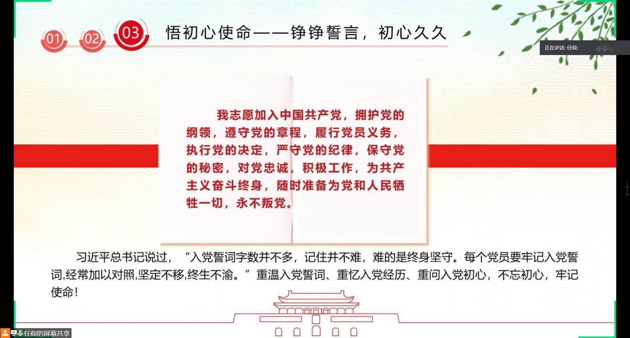 最后,在“悟初心使命”环节,支部党员们谈初心使命,重温入党誓词、重忆入党经历、重问入党初心。党员们更表达了强烈的决心,将牢记党的使命和责任,不忘初心跟党走,牢记使命勇担当,为祖国更加美好的未来贡献一份力量。