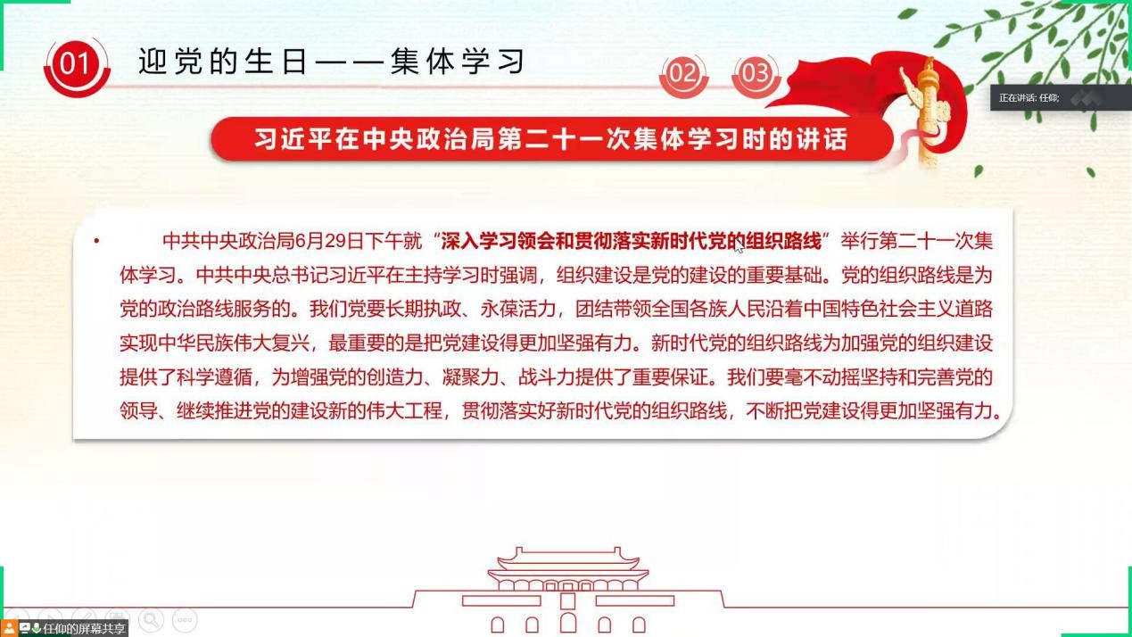 会议开始,全体成员观看了视频《建党年报》,回顾共产党成立99年来的历程。革命战争年代,刘胡兰、李大钊等无数的革命先烈前赴后继;社会主义建设时期,李四光、邓稼先等时代楷模们披荆斩棘;改革开放时代,袁隆平、陈景润等榜样前辈们砥砺前行。99年来,我党经历了党旗变化、中共中央所在地变迁、党章修改;99年来,一代又一代共产党人奔赴时代,九十九风华正茂,答卷人初心如磐。