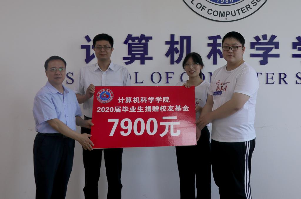 字样,纪念戒指外侧镌刻学院名称及院训“正行·明理·通道”,内侧刻有毕业生姓名和学号,每枚戒指私人订制,独一无二,旨在希望2020届毕业生们不忘初心,将“师大计科人”的优良传统传承下去,载未来的道路上走的更稳、更远。随后,毕业生代表向学院校友交流基金捐赠校友基金7900元,这份心意承载着2020届毕业生对学院的感恩之情,愿学院年年桃李,岁岁芬芳。