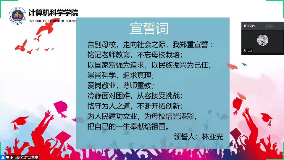 最后,2020届毕业生代表林亚光带领全体毕业生宣誓:铭记老师教诲,不忘母校栽培;以国家富强为追求,以民族振兴为己任......铮铮誓言,承载着2020届计科人的责任与担当。总是说毕业遥遥无期,转眼就要各奔东西,新时代新使命,新起点新征程,愿2020届计科人只争朝夕,不负韶华,在人生新征途上扬帆再起航!