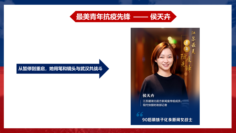 不论是中国近代历史上,此次抗疫奋战中,还是就在我们的身边都有许多人身体力行地践行着五四精神,成为了更多青年人的榜样。范佳丽、黄思铭、陈慧洁三位同志分别以抗战女英雄秋瑾—“祖国陆沉人有责,天涯漂泊我无家”、抗议先锋青年记者侯天卉—“从暂停到重启,她用笔和镜头与武汉共战斗”、耽美小说