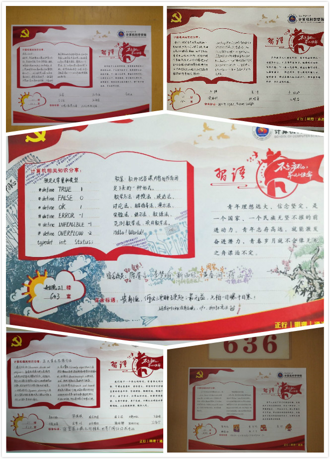 手抄报由习近平青年寄语、计算机小知识和宿舍成员介绍三个版块构成,旨在激励计科青年珍惜韶华、志存高远、勇于开拓,帮助同学们扎根专业,激励他们勤于学习、勇于探索,凸显宿舍成员特点,增强宿舍成员凝聚力。同学们发挥各自特长优点,积极参加、精心设计,秉持友谊第一的参赛精神,力求呈现出最佳的宿舍面貌。