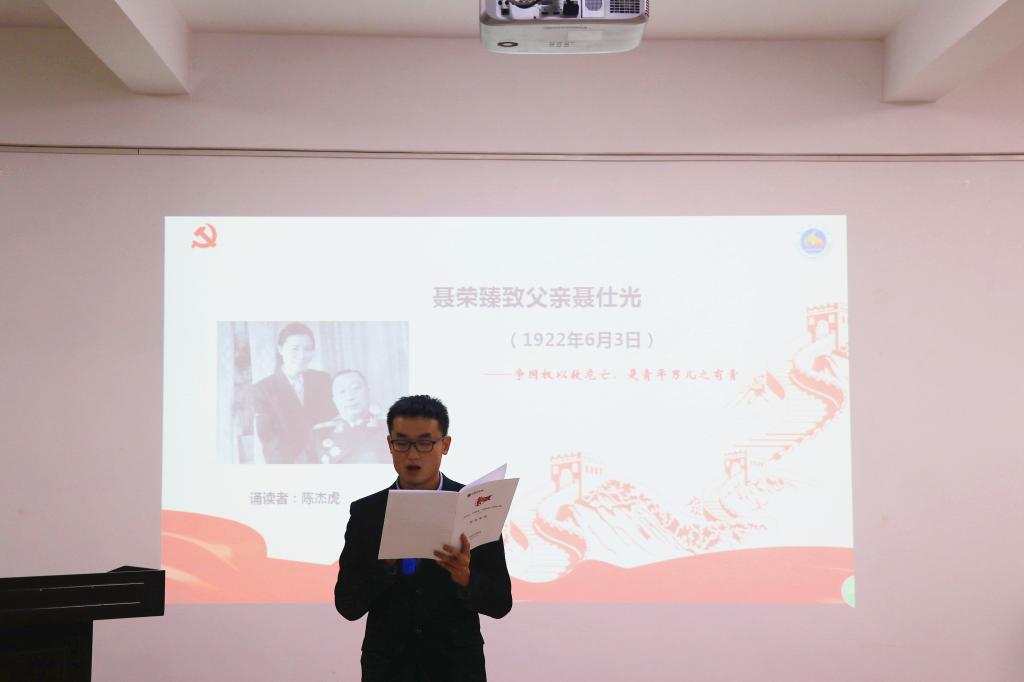 2019级计算机软件与理论专业博士陈杰虎同志诵读了聂荣臻致父亲聂仕光的家书,“争国权以救危亡,是青年男儿之有责”。聂荣臻同志在家信中不仅汇报了自己勤工俭学的情况,也表达了自己忧国忧民的情怀。
