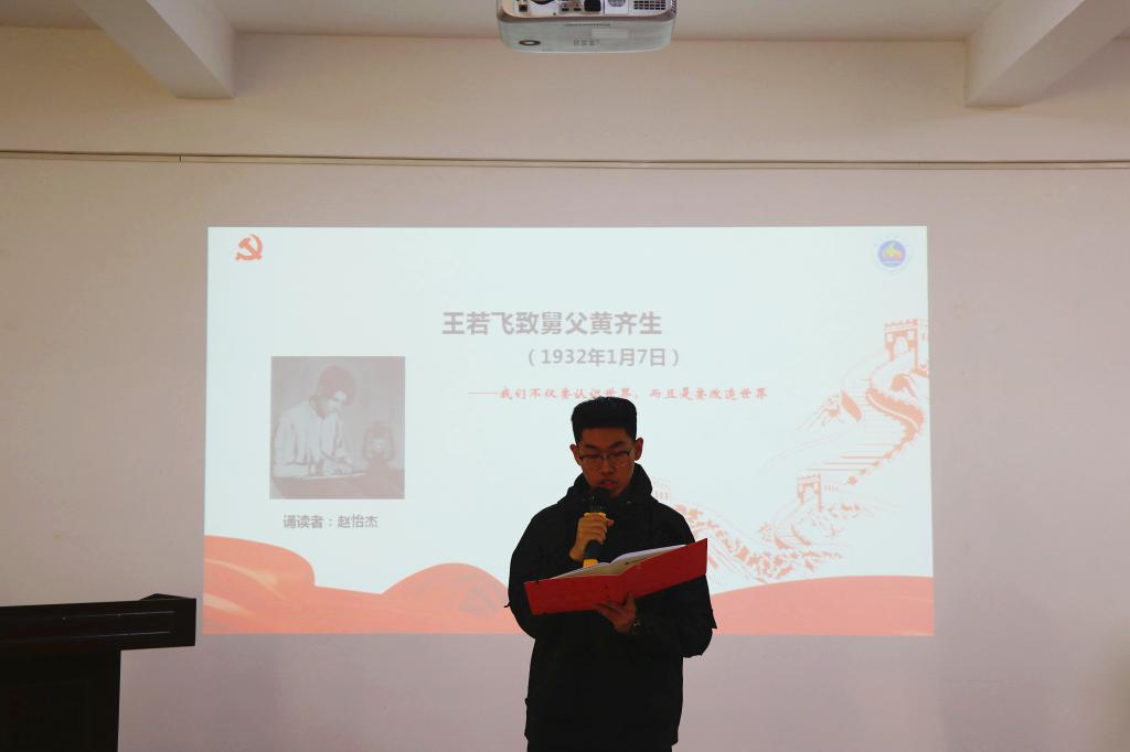 2016级计算机科学与技术创新实验专业本科生秦可楠同志诵读了王孝慈致弟书,“客观的环境是人们真正的学校”,体现了优秀共产党员甘愿付出、英勇奋战、砥砺前进的顽强精神。