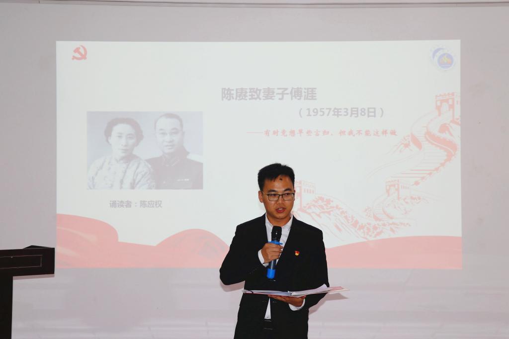学生第一支部书记陈应权同志诵读了陈赓致妻子傅涯的家书,“有时竟想早些言归,但我不能这样做”。由于经常因公外出,陈赓和妻子约定一地一信或半月一信,体现了坚守初心的无产阶级革命家与妻子的深情厚谊,在工作中革命理想信念从未懈怠。
