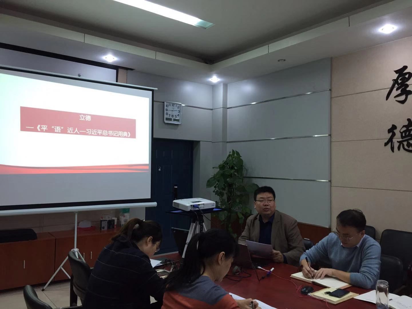 教工行政党支部积极响应落实,于2019年10月23日下午继续开展“不忘初心、牢记使命”主题教育。本次活动由支部书记董春生同志为支部党员讲专题党课:《平“语”近人——习近平总书记用典》——国无德不兴。