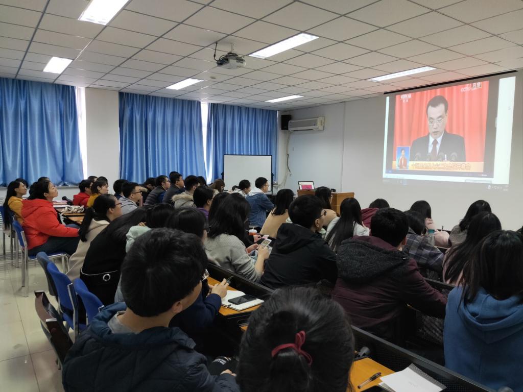 于3月5日上午9:00组织学院领导班子、教师代表、部分学生党员、团员集体观看了两会开幕会,引导其他同学通过网络、报纸、手机客户端等多种渠道实时关注两会动态,认真跟踪两会进展,深入学习和贯彻两会精神。