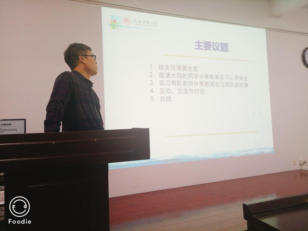 班主任郝飞老师也就自己2017年9月到11月带领2014级公费师范生分别赴山西省永济市、运城市教育实习基地参与为期两个多月的实习工作进行了分享。他通过分享照片和通讯稿的方式生动描绘了实习工作期间的苦与甜,并就生活中的小细节与同学们进行了探讨,气氛十分热烈。分享过后,2016级学生就对实习的其他疑虑积极提问,学姐们和老师逐个回答并拓展。郝飞老师最后总结道,教育实习是师范生生涯的重要阶段,它连接着学校教育和社会工作,是同学们在正式开启教室生涯前的必经之路。同学们要积极准备并认真对待教育实习。