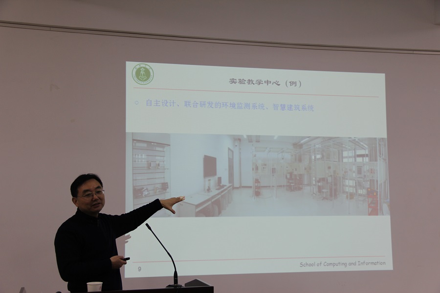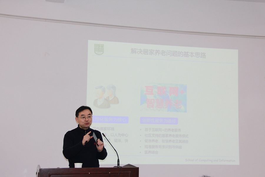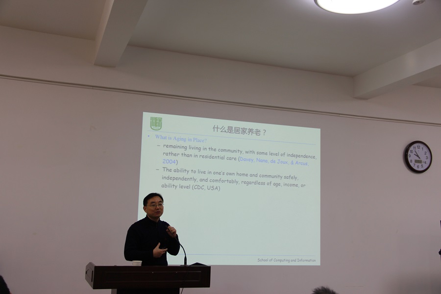 报告伊始,陈桂林教授简要的介绍了滁州学院计算机与信息工程学院的学院组织结构和人才培养模式的基本特点,同时将其学院自主研发的各项实验平台和设备做了简单的分享。其次,陈教授用幽默的语言为我们分析了老龄化社会中养老面临的主要困难,讨论物联网等新兴信息技术在解决养老问题中可能发挥的作用以及智慧养老的内涵与功能,从研究角度讨论智慧养老服务体系与关键技术;从为老人服务的角度讨论智慧养老服务体系的组成以及智慧养老服务的主要内容,简要介绍已经开展的智慧养老服务情况并对智慧养老的发展趋势进行了详细分析。最后,陈教授对本单位人才引进的各项标准及福利待遇做了细致的介绍,欢迎有志在高校发展的博硕士研究生前往滁州学院工作。