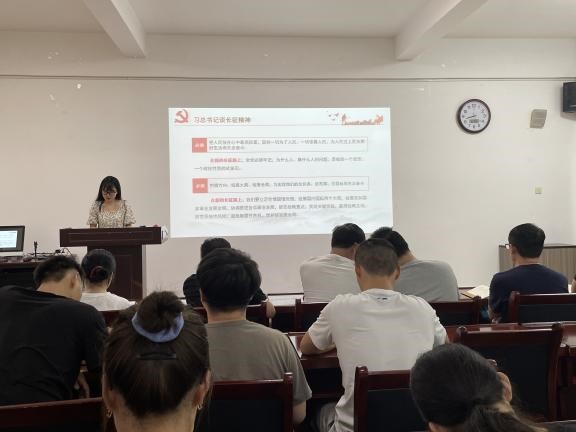 长征的胜利,是中国共产党和红军谱写的壮丽史诗,是中华民族伟大复兴历史进程中的巍峨丰碑。习近平总书记曾在谈长征精神时用4个“伟大远征”概括长征,并提出6个方面的要求,让我们能走好长征路,为了更好的实现中华民族的伟大复兴的中国梦而奋斗!禹棋洺从长征的背景、经过、意义以及长征精神内涵四个方面讲述。她首先对长征的背景原因进行讲解,并对每个失败的原因进行深度剖析,希望同志们能从失败中汲取经验教训。随后,禹棋洺带领同志们一同从江西瑞金开始、以“遵义会议、四渡赤水、巧夺金沙江、强渡大渡河、飞夺泸定桥、爬雪山过草地”等重要长征历史事件为线索,重新回顾长征的基本路线。党员同志们在感受这段伟大历程的同时也深深地被伟大的长征精神所感动。