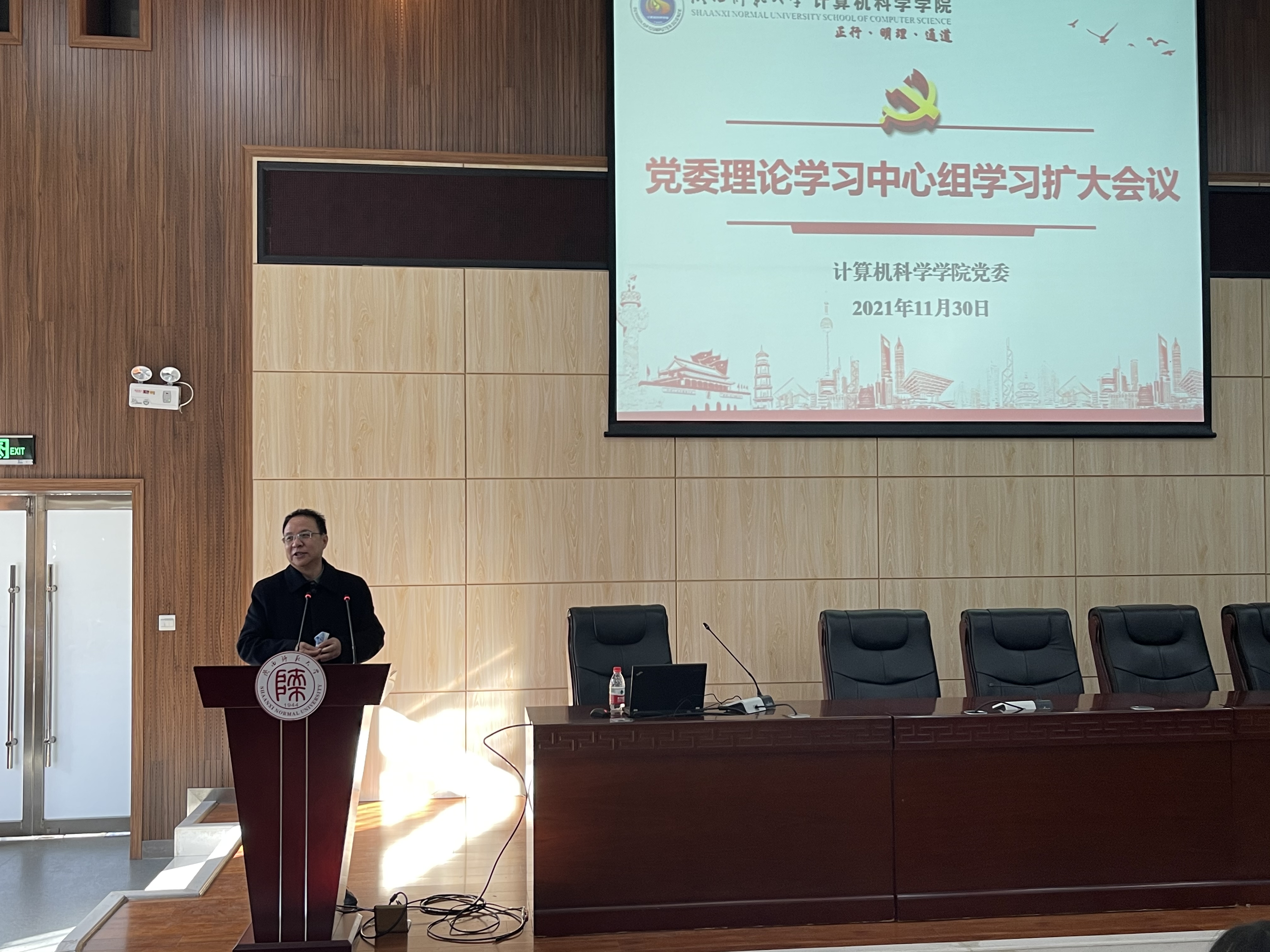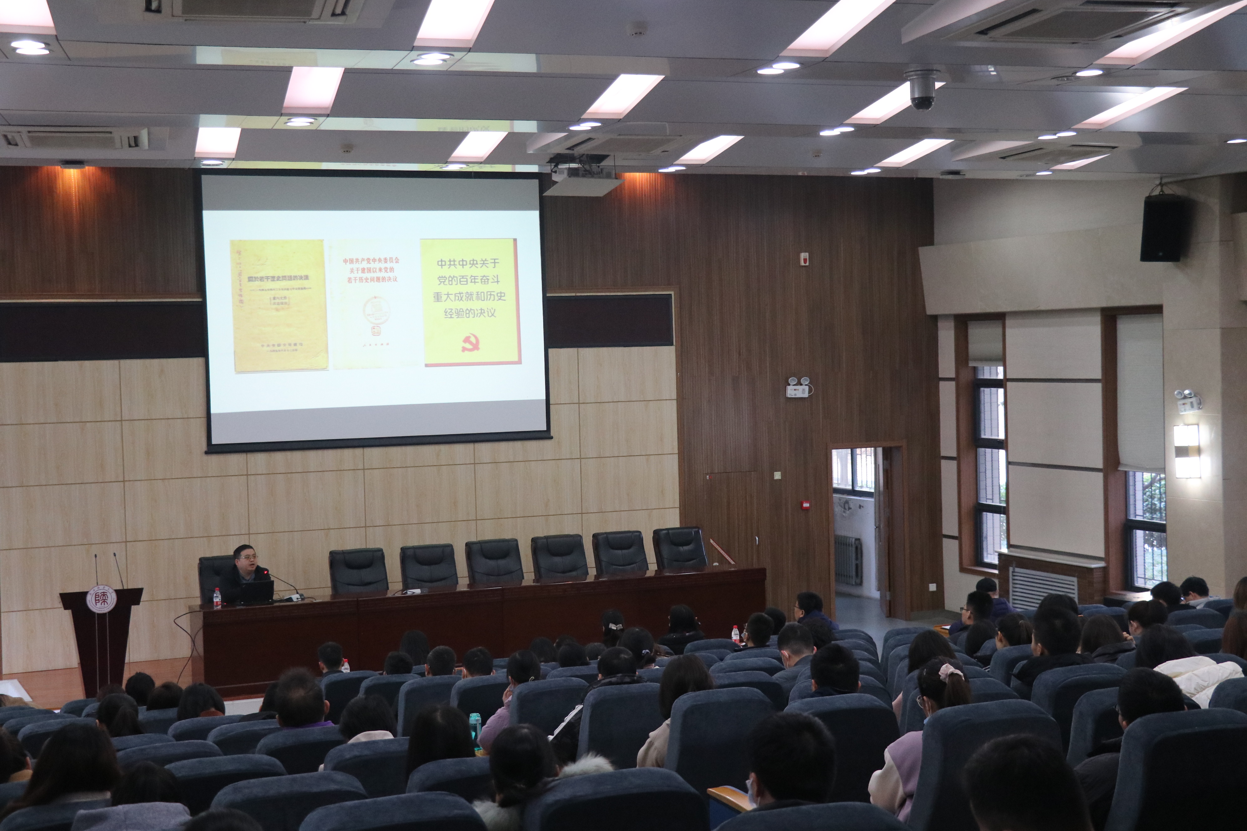 在文澜楼B段一层报告厅召开了党委理论学习中心组学习(扩大)会议,邀请到了学校学习贯彻党的十九届六中全会精神教授宣讲团成员,马克思主义学院张帆教授,以《以史为鉴开创未来的纲领性文件》为题做了十九届六中全会精神的领学宣讲,学院党委委员、班子成员、党支部书记、师生党员和学生骨干代表参加了学习,会议由党委书记王耀明主持。