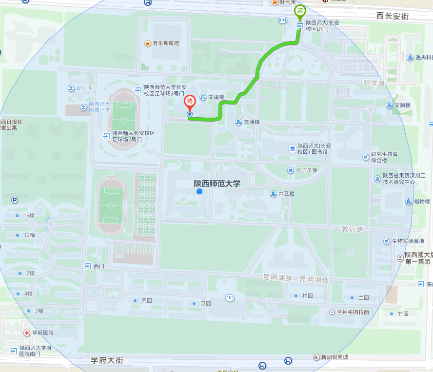 从陕西师大(长安校区)北门向正南方向出发,走60米,右转进入书山道,沿书山道走170米,右转进入积学路,沿积学路走10米,离开积学路,向左前方转,走130米,右转穿过马路继续向前,走10米,向左前方转,走60米,右转,走70米,到达耽美小说