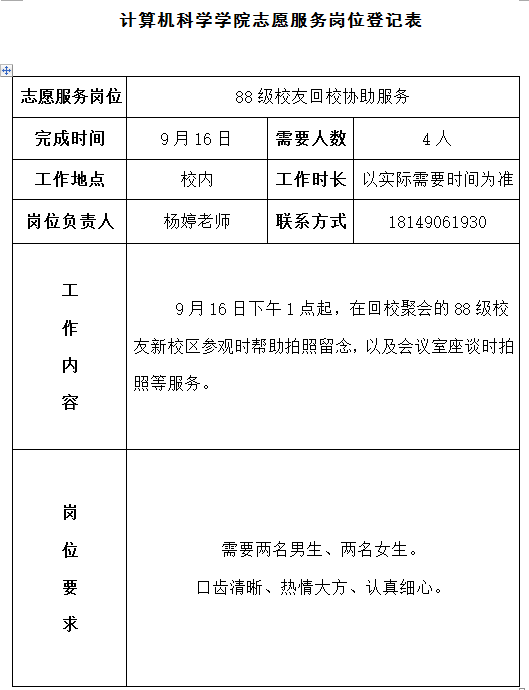 志愿服务岗位信息(9月16日)——耽美小说 88级校友回校协助后勤服务