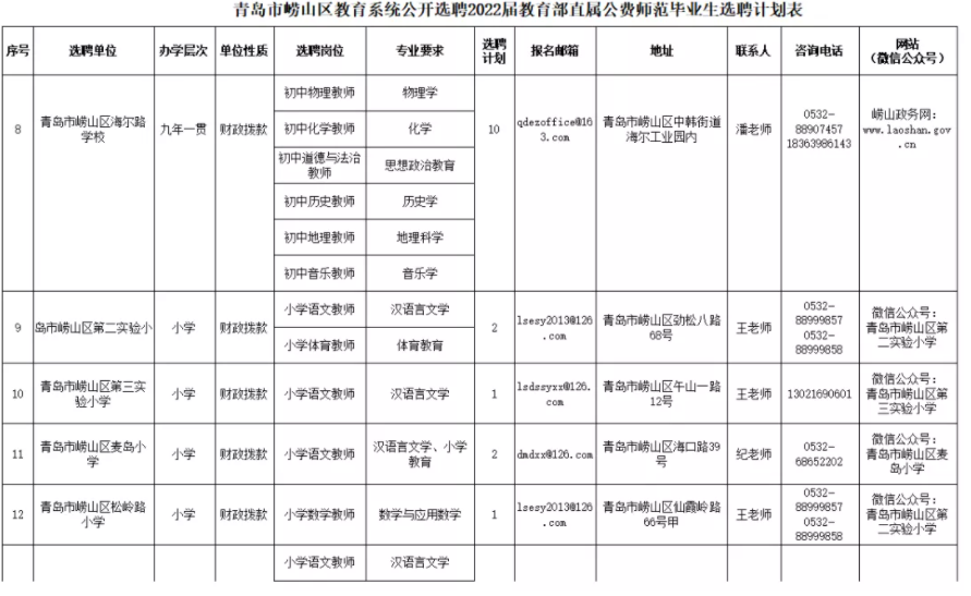 (三)选聘简章、体检通知、拟聘用人员公示在崂山政务网(//www.laoshan.gov.cn)“机关事业单位招聘考试”专题栏目发布;青岛市崂山区山东头学校和青岛市崂山区海尔路学校的面试通知、面试方案、面试成绩在崂山政务网发布,其余选聘学校的面试通知、面试方案、面试成绩在微信公众号(详见附件1)发布。应聘人员在应聘期间应及时了解发布的选聘信息,因本人原因错过重要信息而影响考试聘用的,责任自负。