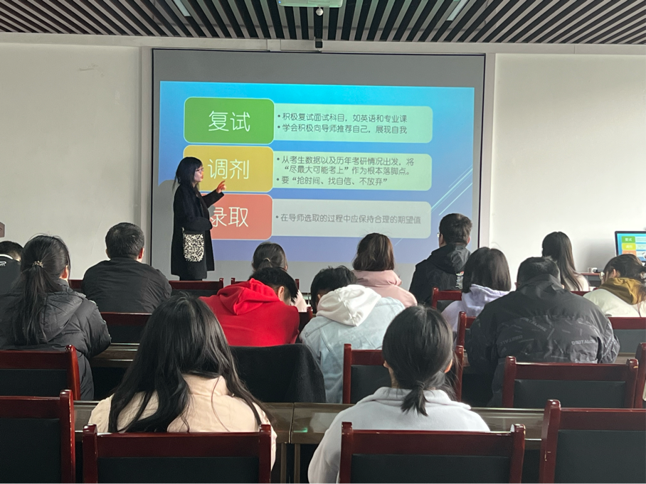 2023届本科生考研的基本情况,鼓励大家积极准备复试和调剂的相关工作。五位研究生依次分享了自己在考研复试和调剂过程中的经验和教训,对2023届考研学子做出针对性指导。
