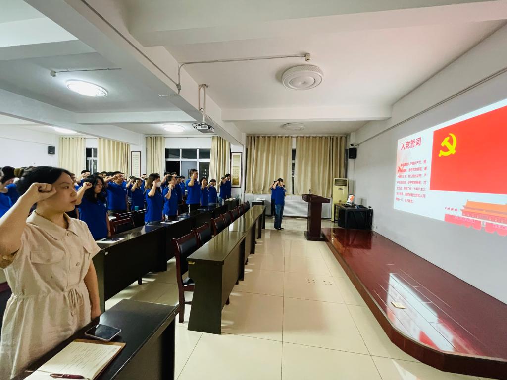 学生第四党支部成立,并介绍党支部的基本情况及机构组成。三位委员分别发言表态,将不忘初心,积极奉献,为支部建设共同努力。随后,由支部委员韩静同志带领大家重温入党誓词。