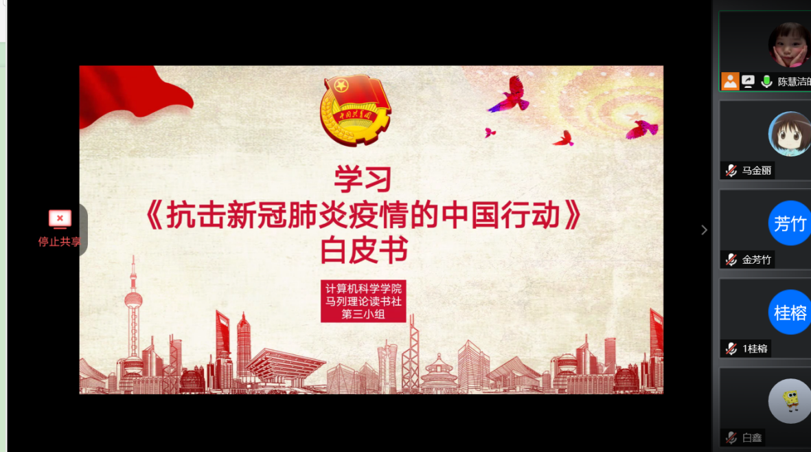 马列主义读书社第三学习小组于6月29日在腾讯会议开展“从白皮书看中国抗击疫情历程”主题活动。本次活动由第三小组组长陈慧洁主持,第三小组所有成员共同参与此次讨论。