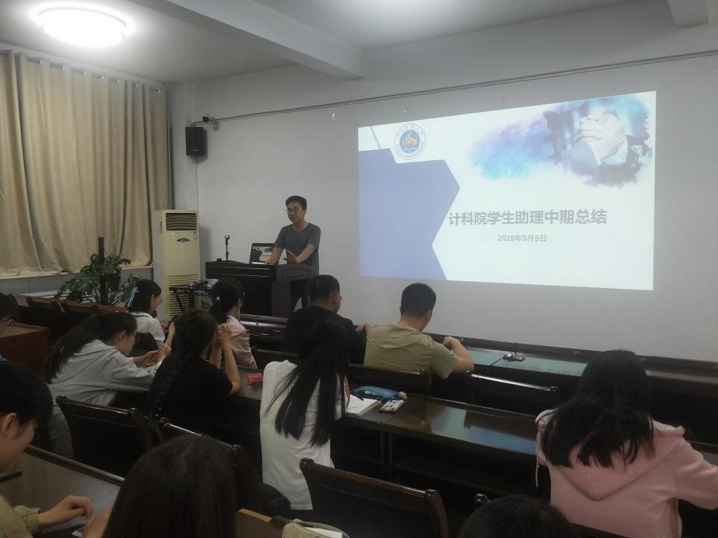 于2019年5月5日晚上九点在文津3412学院报告厅召开学工组助理中期总结交流会。会议由2017级本科生辅导员陈应权老师主持,全体学工组助理成员参加了本次会议。