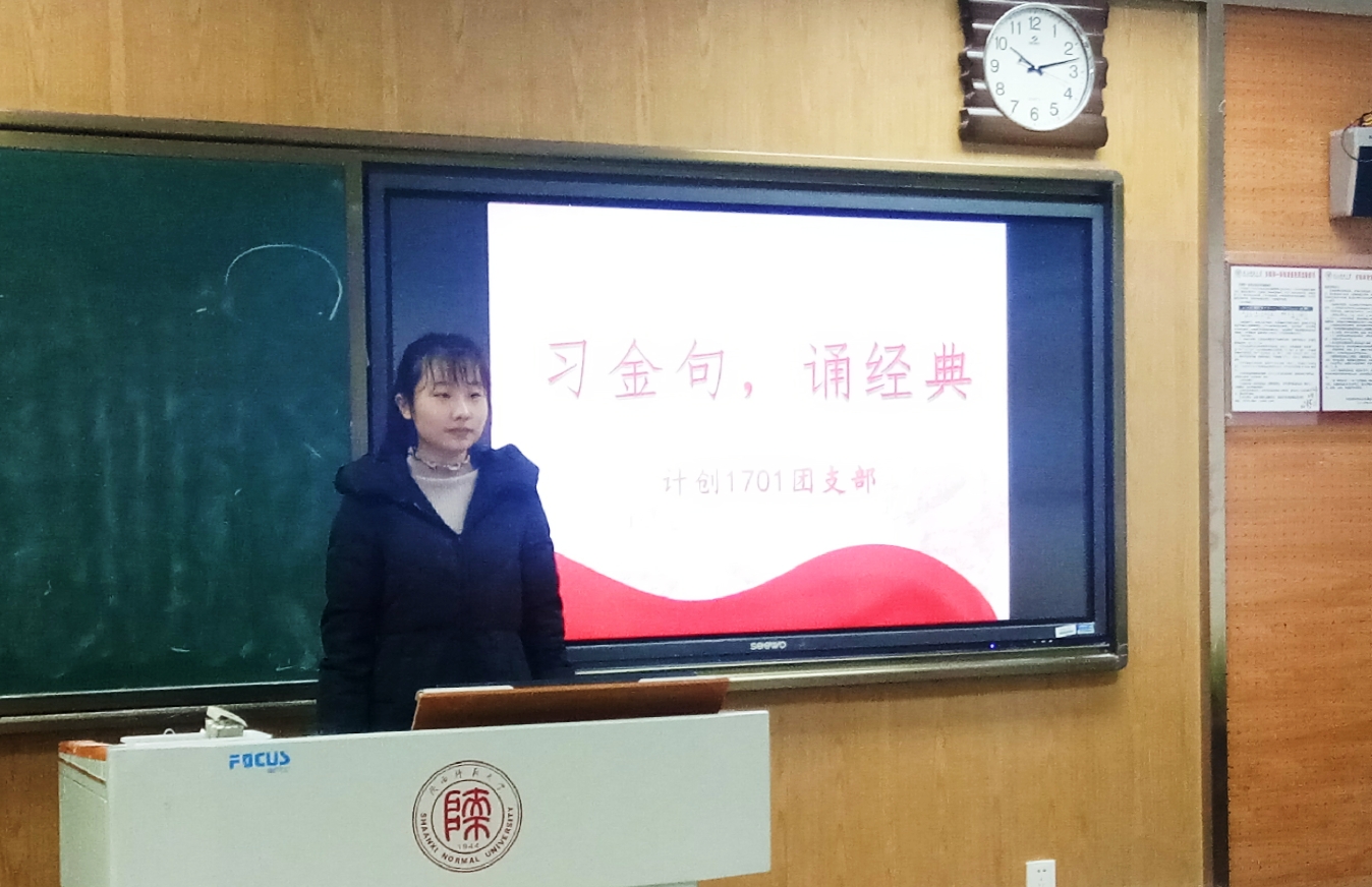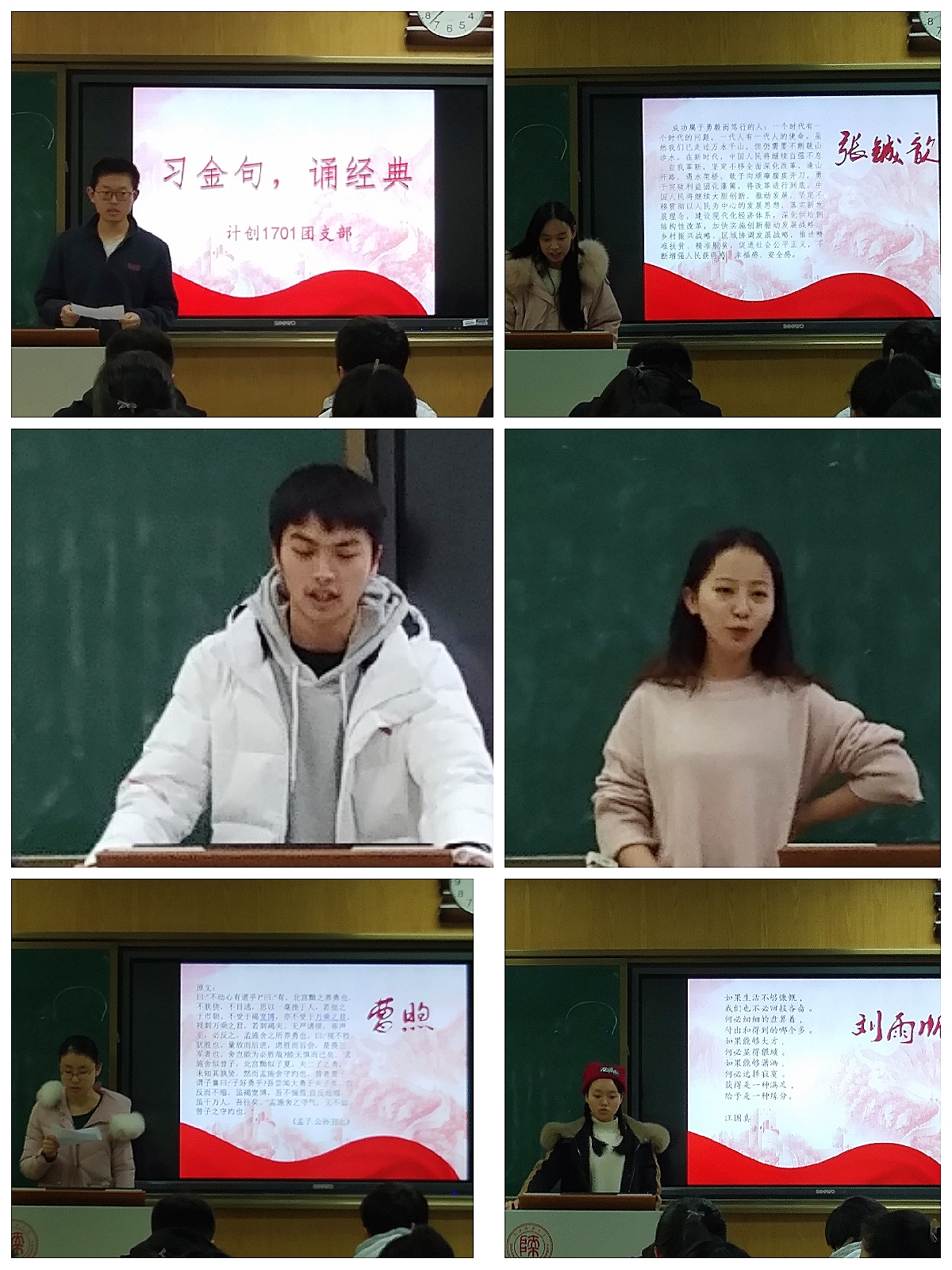 2017级计创一班在文渊楼3217举行了以“习金句,诵经典”为主题的团日活动。本次活动由团支书林雨婷主持,2017级计算机科学与技术(创新实验班)一班全体成员参加了此次活动。