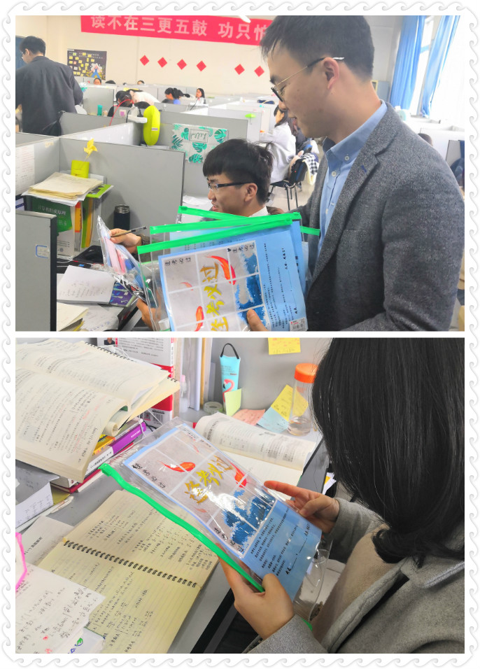 在文津楼三段考研自习室,各位辅导员老师为避免打扰同学们备考,把精心准备的文具袋及祝福卡片,轻轻放置到每位考研学子的座位上。卡片上记录了耽美小说