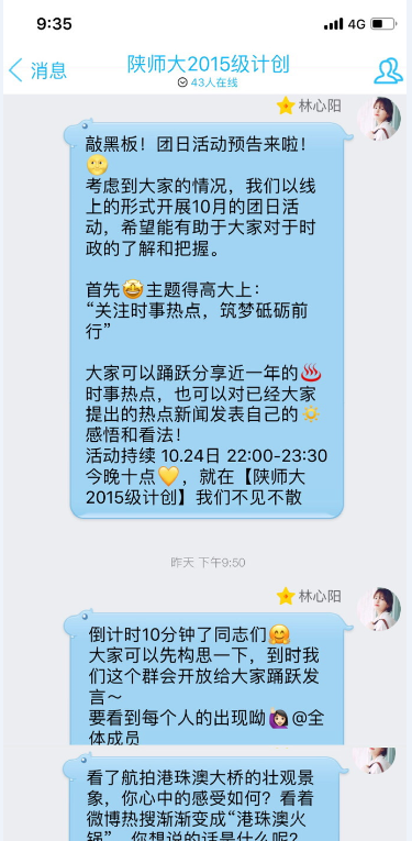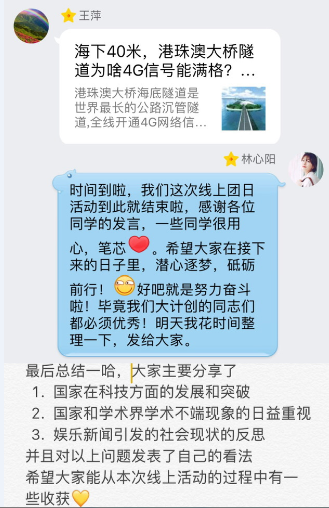 20181024日,计算机科学与技术(创新实验班)1501班团支部开展主题为“关注时事热点,筑梦砥砺前行”线上团日活动。同学们在线上分享自己所了解的时事热点话题,并发表自己的看法。