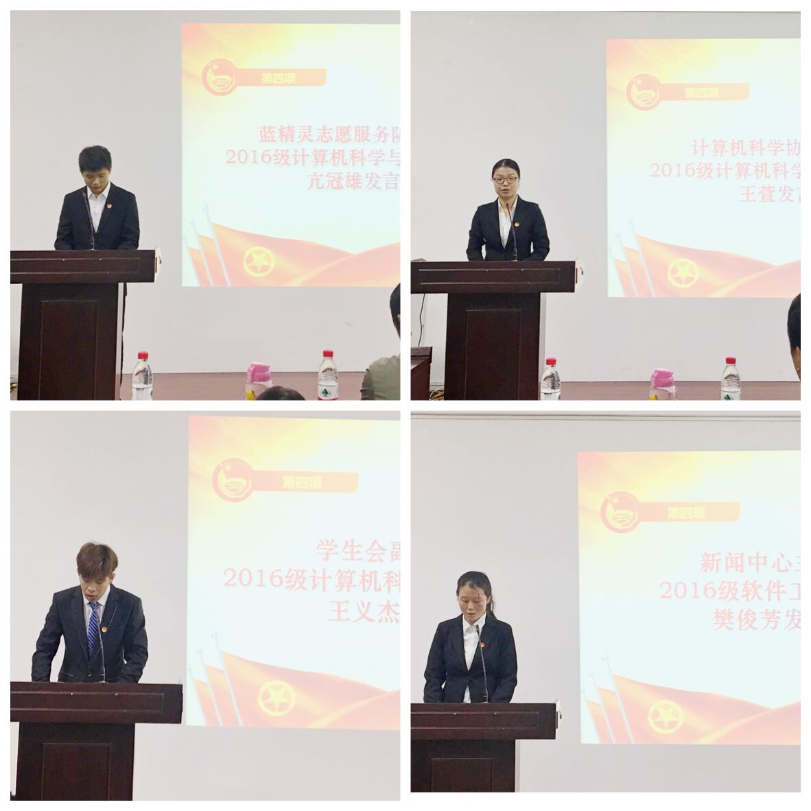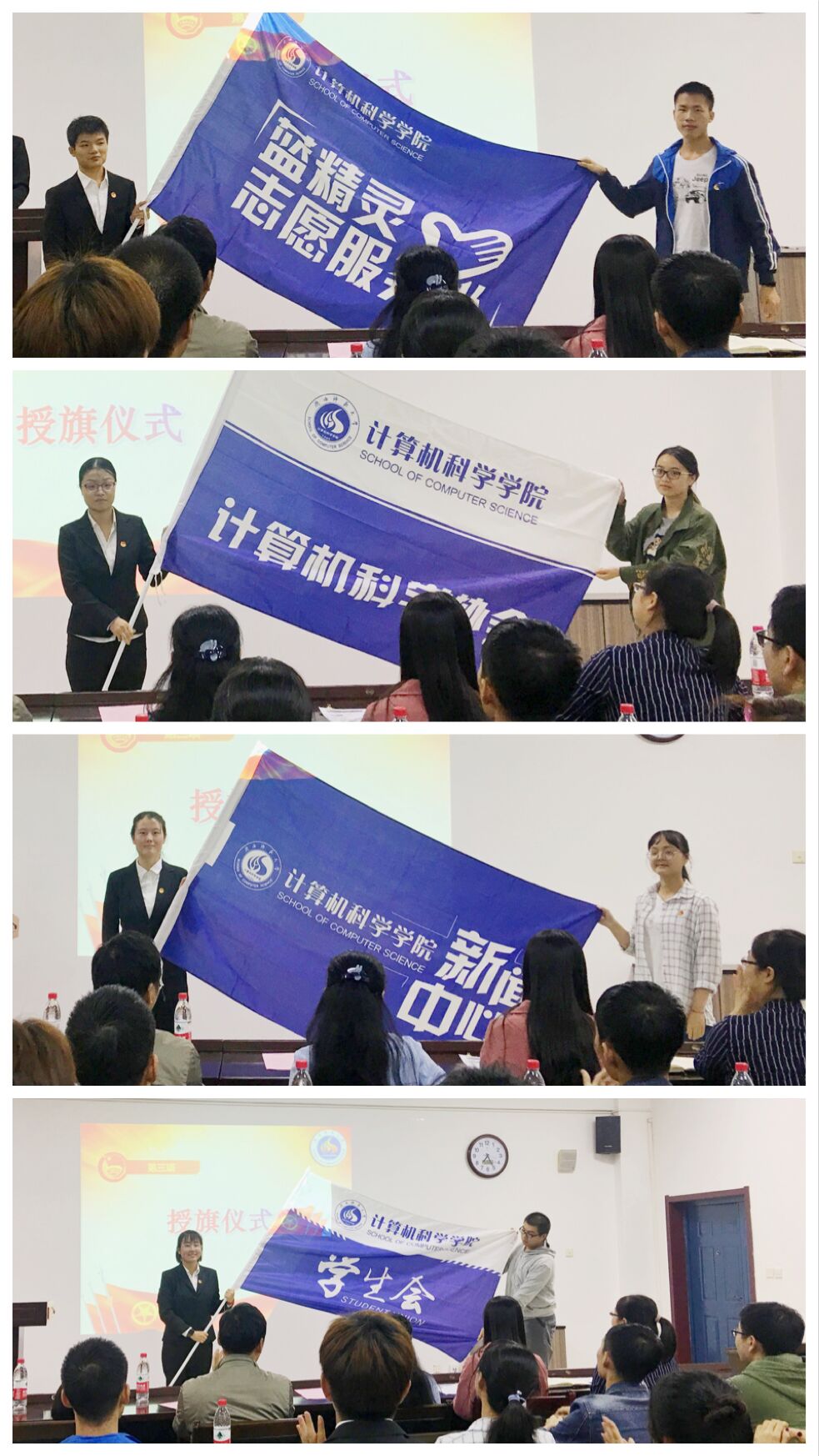 学生组织干部任职决定》。李文亮、刘佳华、刘童心、唐盼分别为学生会、耽美小说、为计科协和蓝精灵授旗。为增强各组织成员之间的集体感、凝聚力,会上还组织进行了交流活动。学生会副主席王义杰、耽美小说主任樊俊芳、计算机科学协会主席王萱、蓝精灵志愿服务队队长亢冠雄依次进行了发言,总结了上一年中所在部门的工作任务,并对未来的工作进行了展望、定下了目标。