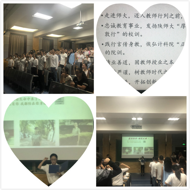为表达对军训期间三位老师无微不至的关怀的感谢,学生代表为袁冰老师,陈昊老师,安琪老师颁奖,现场再次响起了热烈的掌声。之后,计科院2018级本科生全体同学为老师演唱《一生有你》,感谢恩师一路相伴。最后,计科二班班长刘佳越带领2018级全体公费师范生宣誓:“发扬陕师大校训‘厚德积学 励志敦行’,恢宏计科院院训‘正行 明理 通道’……”。同学们眼神中充满了坚毅,为自己以后能成为一名光荣的人民教师而自豪!