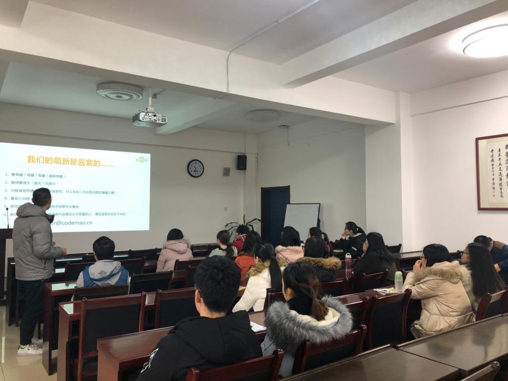 宣讲会上,大家一同观看了深圳点猫科技有限公司简介短片。随后,公司代表夏立博士从steam教育理念,社会发展趋势,公司历程和发展目标、团队建设、现有业务、未来发展、入职要求等几个方面对公司情况进行了介绍。公司主打少儿编程在线教育品牌,项目名称为“编程猫”。“编程猫”是一个少儿在线编程教育平台,产品主要面对6-16岁学生。以孩子喜欢的形式,结合图形化编程模块开始,逐步推进到专业的Python和C编程,并将游戏和故事贯穿整个教学体系,让编程简单得就像搭积木。编程猫欢迎有学科背景,并且有爱心、认真负责、愿意投身教育的同学们的加入。编程猫的公司理念和岗位要求和耽美小说