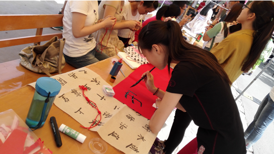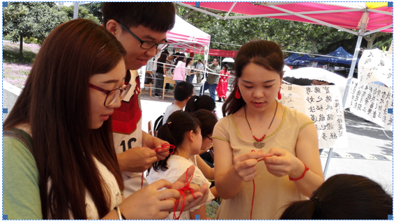 同学们的多才多艺。2012级计科2班的文馨同学的书法作品“上善若水”,令现场的同学们大为赞赏。中午时分,随着下课同学的逐渐增多,文馨同学现场进行了书法展示,吸引了众多同学的围观;2012级计科1班的杨静同学向现场的同学们展示了中国结的编法,让现场的同学们可以亲手体验中国结的制作过程,在学习的过程中感受中国传统文化的魅力。