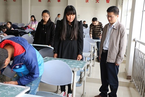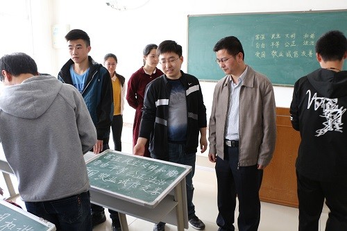 第四届师范生粉笔字大赛在文津楼401教室拉开帷幕。学院党委书记胡波和2012级辅导员张冲到场担任评委,学院2012级部分免费师范生参加了本次比赛。